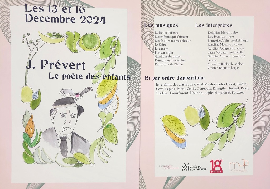 Le 04-02-25 Musée de Montmartre (78) 19H – Concert Hommage à Jacques Prévert Françoise ALBIN, nyckel harpa, Virginie BACQUET, harpe, Lise HENNON, flûte, Roseline MACARIO, violon Aurélien QUIGNARD, violon, Ariane DELLENBACH, alto & Laure VOLPATO, violoncelle