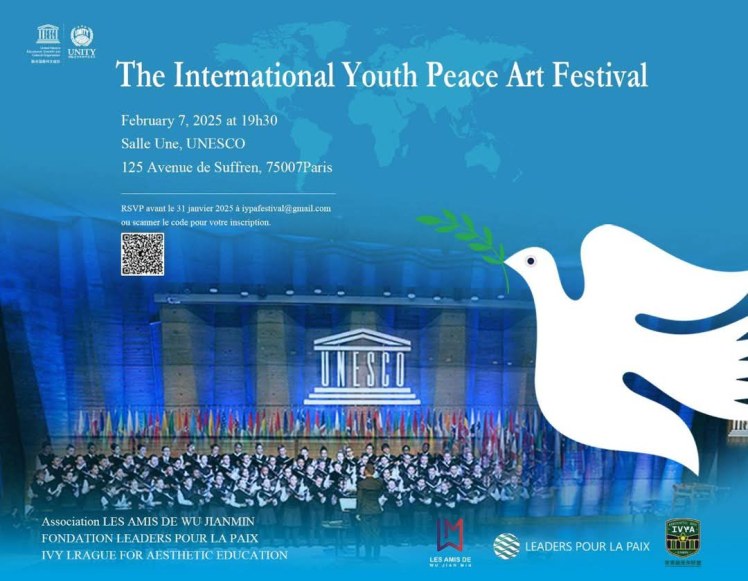 Le 07-02-25 UNESCO Paris 19h30 – Concert pour la paix – Association Les Amis de Wu Jianmin – Fondation Leaders pour la Paix – Collaboration de « Ensemble International Love Echoes », Konstantin Lebedev (chant), Laure Volpato (violoncelle), Violetta Donini (piano). Artiste invitée Viktoria Hrydiuk (danse)