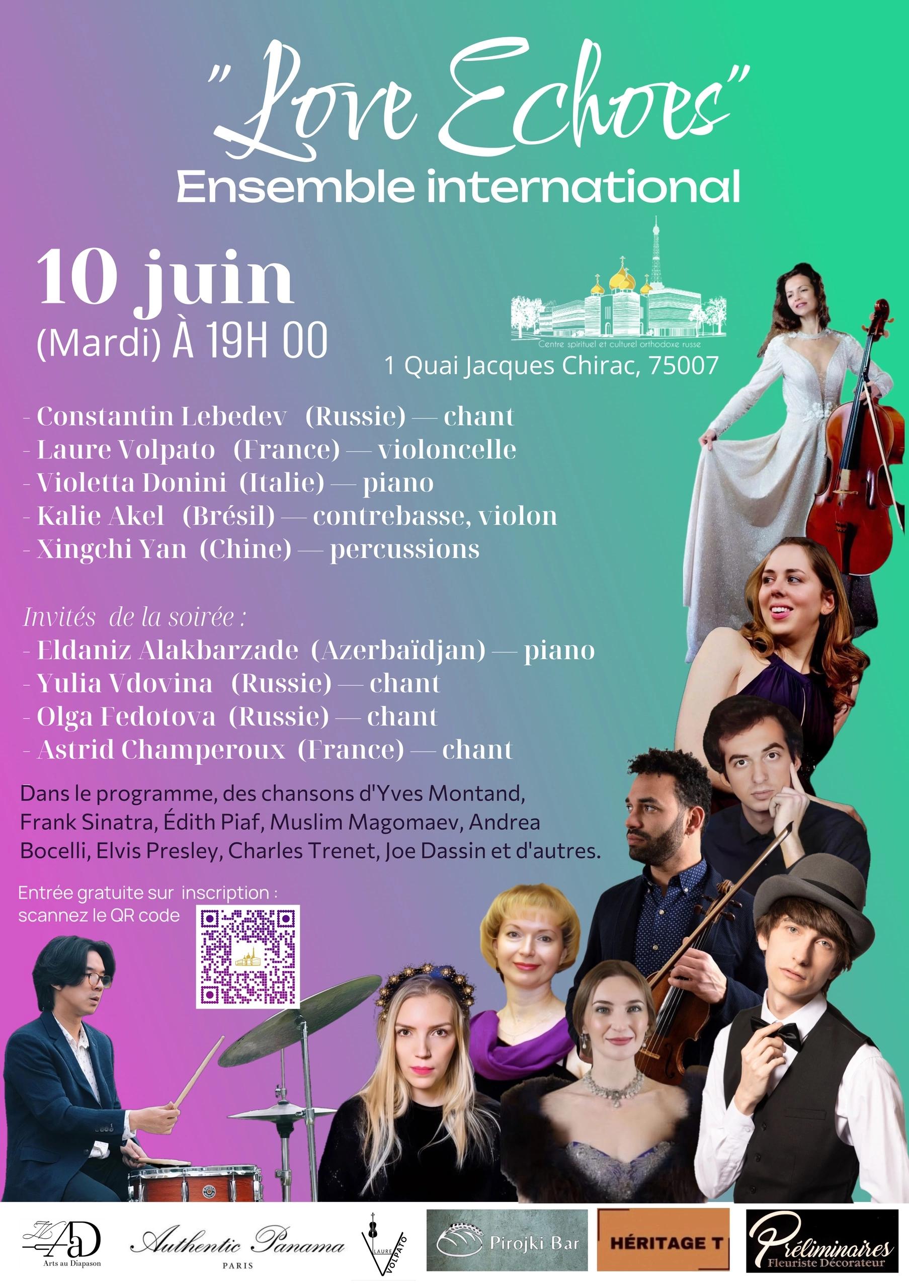 Le 10-06-25 – 19H – Centre sprituel et Culturel Orthodoxe Russe – Concert, Ensemble International Love Echoes, Konstantin Lebedev (chant), Laure Volpato (violoncelle), Kalie Akel (contrebasse), Xinchi Yang (percussions), Violetta Donini (piano)