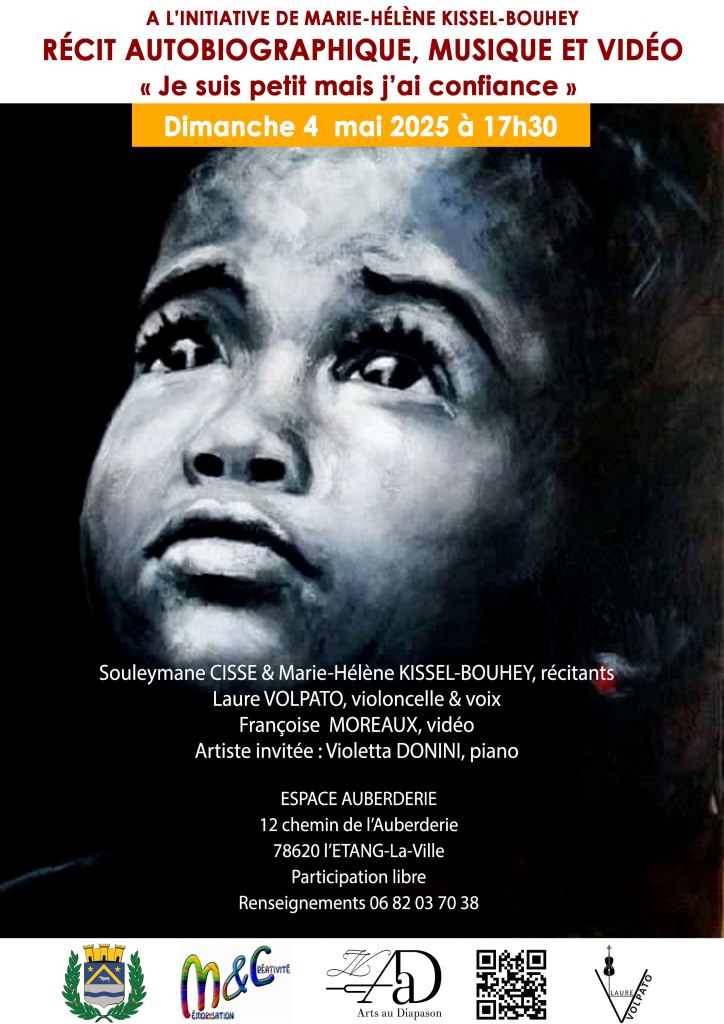 Le 04-05-25 Espace Auberderie (78) 18H – Je suis petit mais j’ai confiance d’après le récit autobiographique de Souleymane CISSE, Violetta Donini, piano, Marie-Hélène KISSEL-BOUHEY, script, mise en scène et flûte, Françoise MOREAUX, & Alain BOUHEY, création vidéo, Laure VOLPATO, violoncelle