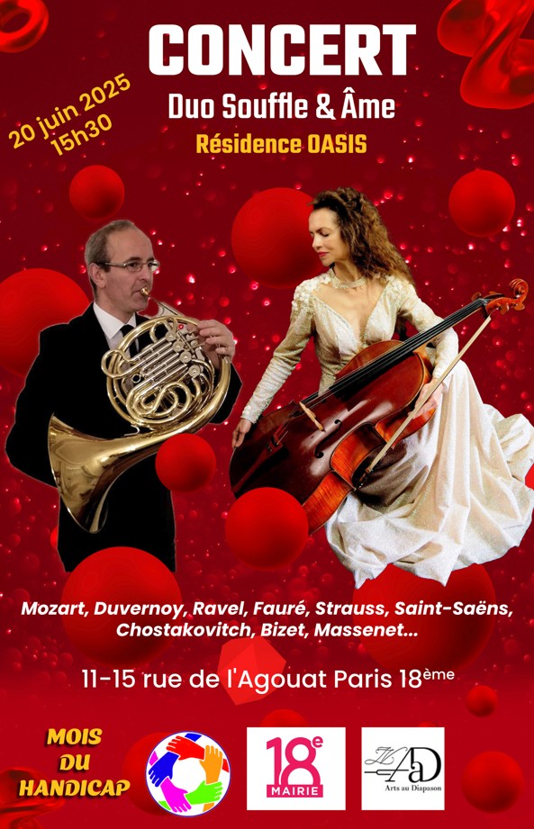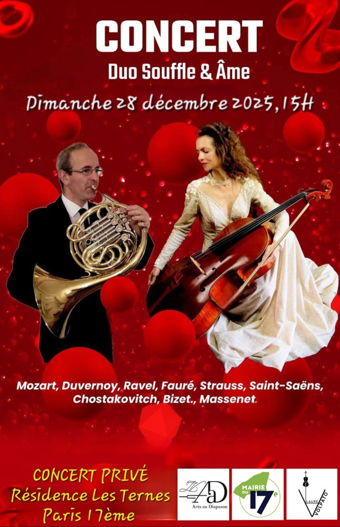 Le 07-10-24 Concert Mairie 18ème 14H30 (75), DUO SOUFFLE & ÂME Laure VOLPATO, violoncelle & et Stéphane Volpato, cor d’harmonie