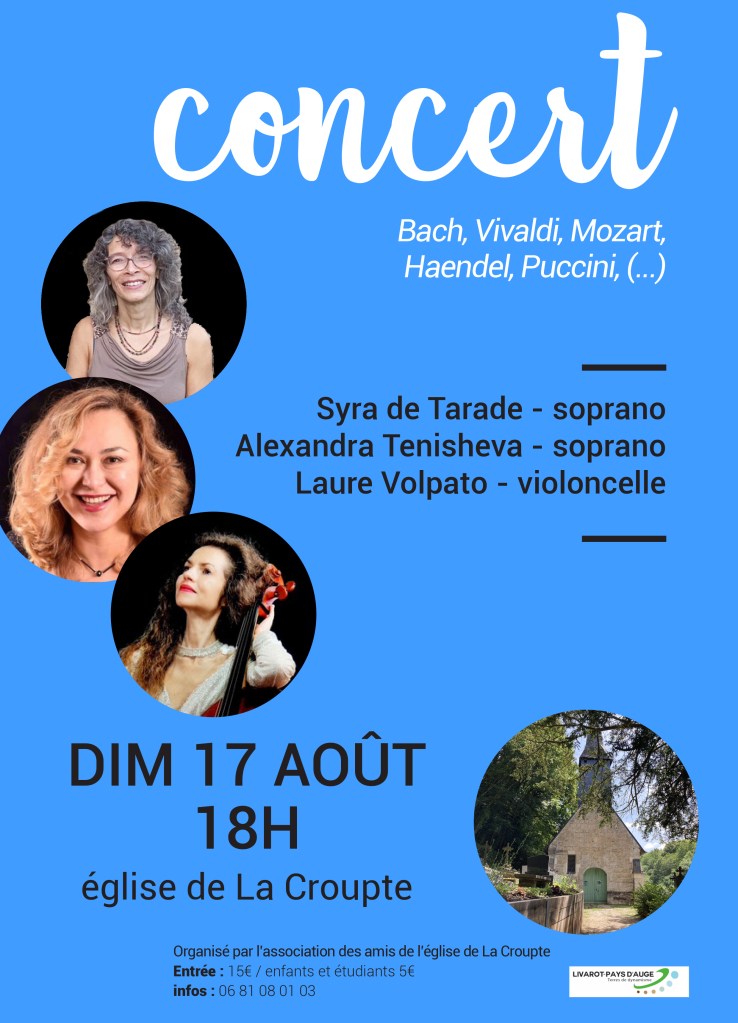 Le 17-08-25 – Normandie, Eglise de la Croupte, 14140 Livarot Pays d’Auge – 3 artistes, Alexandra Tenisheva, soprano, Syra de Tarade, Soprano, Laure Volpato, violoncelle