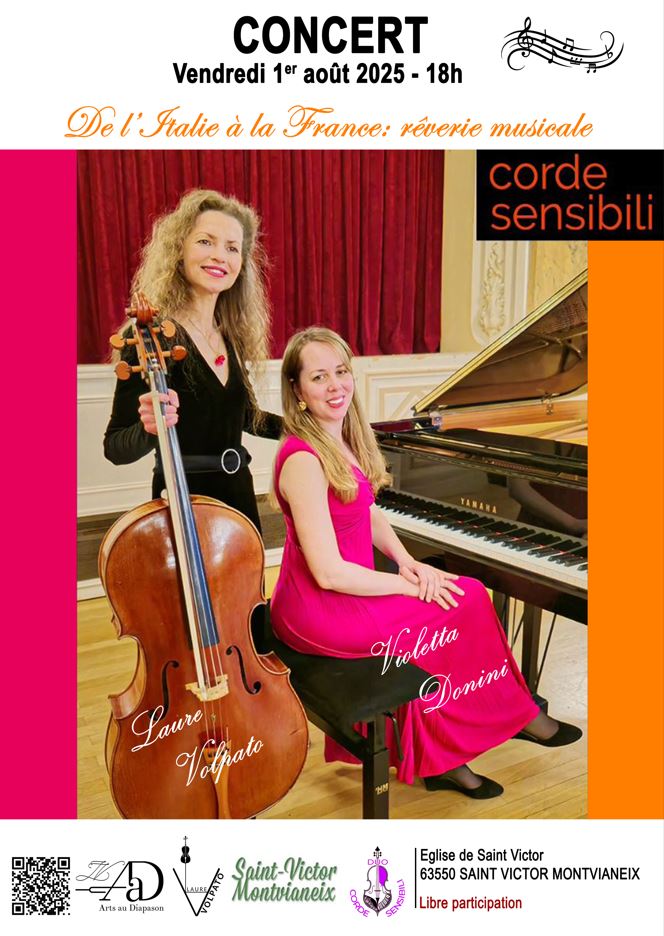 Du 19-07-24 au 27-07-24 Les Rêveries de Saint-Victor à Montvianeix (63): – Le 26-07-24 Eglise Saint-Victor – Concert Duo STRAVAGANTE Laure VOLPATO, violoncelle & Basha SLAVINSKA, accordéon. – Le 24-07-24 – Concert Ensemble de violoncelles Arts Au Diapason & Laure VOLPATO, direction artistique. – Le 22-07-24 – Concert Ensemble de violoncelles Arts Au Diapason & Laure VOLPATO, direction artistique