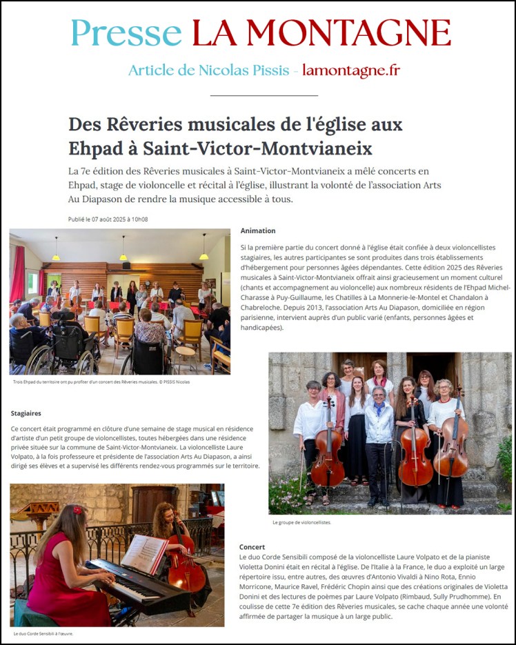 Du 25-07-25 au 02-08-25 Les Rêveries de Saint-Victor à Montvianeix (63): – Le 01-08-25 Église Saint-Victor – Concert Ensemble de violoncelles Arts Au Diapason & Laure VOLPATO, direction artistique – Le 31-07-24 – Domaine de Sarey – Concert Ensemble de violoncelles Arts Au Diapason & Laure VOLPATO, direction artistique & Duo Corde Sensibili- Le 30-07-24 – Concert Ensemble de violoncelles Arts Au Diapason & Laure VOLPATO, direction artistique – Le 28-07-24 – Concert Ensemble de violoncelles Arts Au Diapason & Laure VOLPATO, direction artistique – Le 26-07-24 – Concert Laure VOLPATO, violoncelle