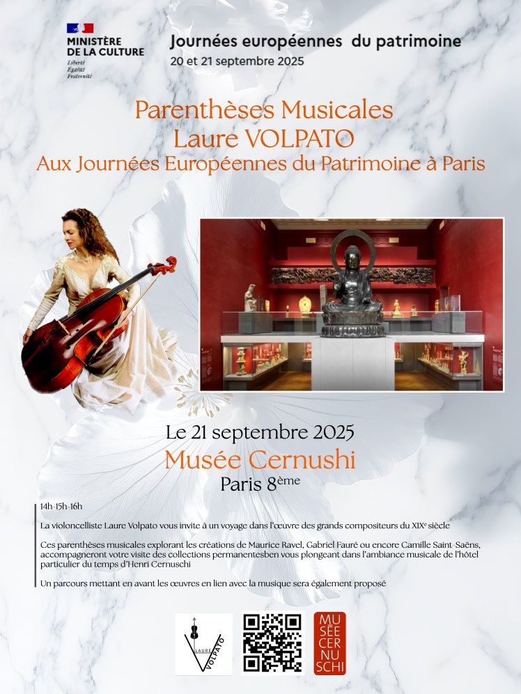 La violoncelliste Laure Volpato vous invite à un voyage dans l’œuvre des grands compositeurs du XIXème siècle. Ces parenthèses musicales explorant les créations de Maurice Ravel, Gabriel Fauré ou encore Camille Saint-Saëns, accompagneront votre visite des collections permanentes en vous plongeant dans l’ambiance musicale de l’hôtel particulier du temps d’Henri Cernuschi Un parcours mettant en avant les œuvres en lien avec la musique sera également proposé.