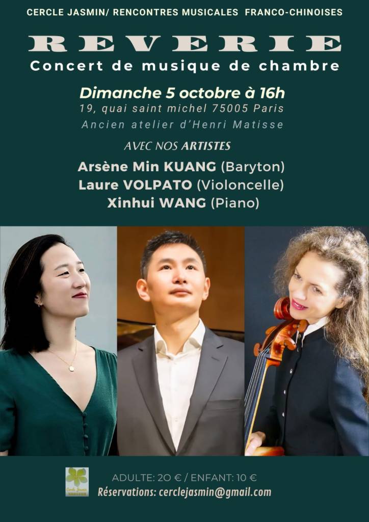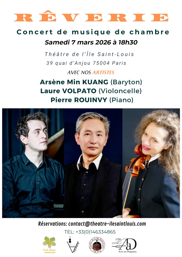 Le 5-10-2025 – Concert – PARIS 5ème (16H, « Rêveries », Arsène Min Kuang, baryton, Laure Volpato, violoncelle ,Xinhui Wang, Piano