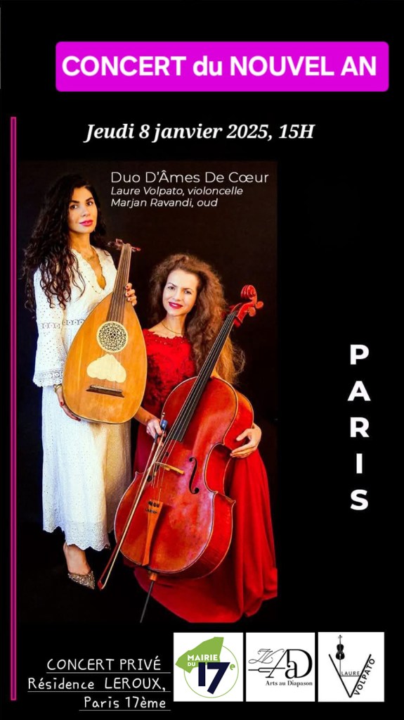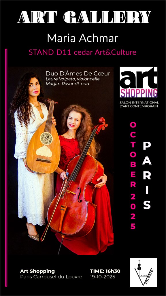 Le 19-10-25 – Carrousel du Louvre 16h30 – Concert Vernissage. Galerie Maria Achmar, Laure Volpato, violoncelle, Marjan Ravandi, oud