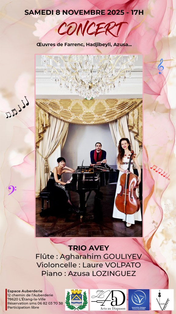 Le 08-11-25, Trio AVEY, L’Etang-La-Ville, Espace Auberderie à 17H. Laure Volpato, violoncelle, Azusa Loringuez, piano, Agharahim Gouliyev, flûte