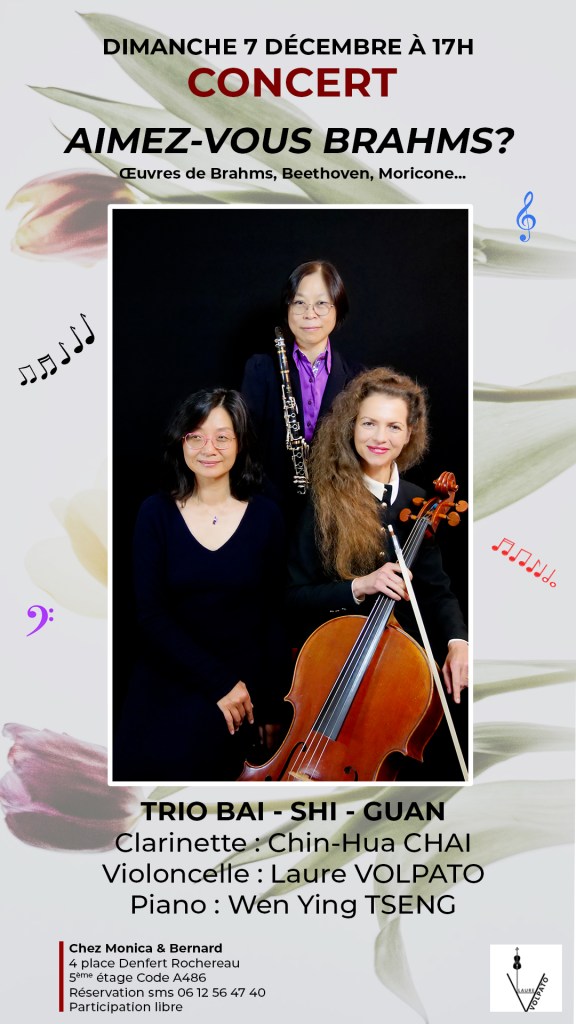 Le 07-12-25, Paris, Concert en Trio, 17H, Wen Ying TSENG, piano, Chin-Hua CHAÏ, clarinette, Laure VOLPATO, violoncelle
