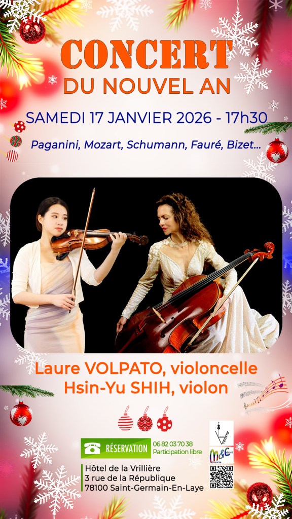 Le 06-12-25, Téléthon, Hôtel de la Vrillière – Saint-Germain-en-Laye, 16H. Duo SHIZUKU, Laure Volpato, violoncelle, Azusa Loringuez, piano. DUO CORDES EN HARMONIE, Laure Volpato, violoncelle, Guilleme Louvet de Montella, guitare