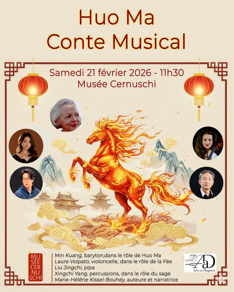 Le 21-02-26, Musée Cernuschi Paris, Concert Franco-Chinois, Le cheval de feu, Xinchi Yang, percussions, Lin Jinchi, pipa, Laure Volpato, violoncelle, script Marie-Hélène Kissel Bouhey
