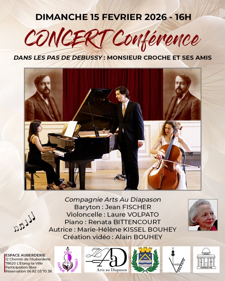 Le 15-02-26, Espace Auberderie, L’Etang-La-Ville, 16H. Monsieur Croche et ses Amis, Jean Fischer, barython, Laure Volpato, violoncelle, Renata Bittencourt, piano, Marie-Hélène Kissel Bouhey, script