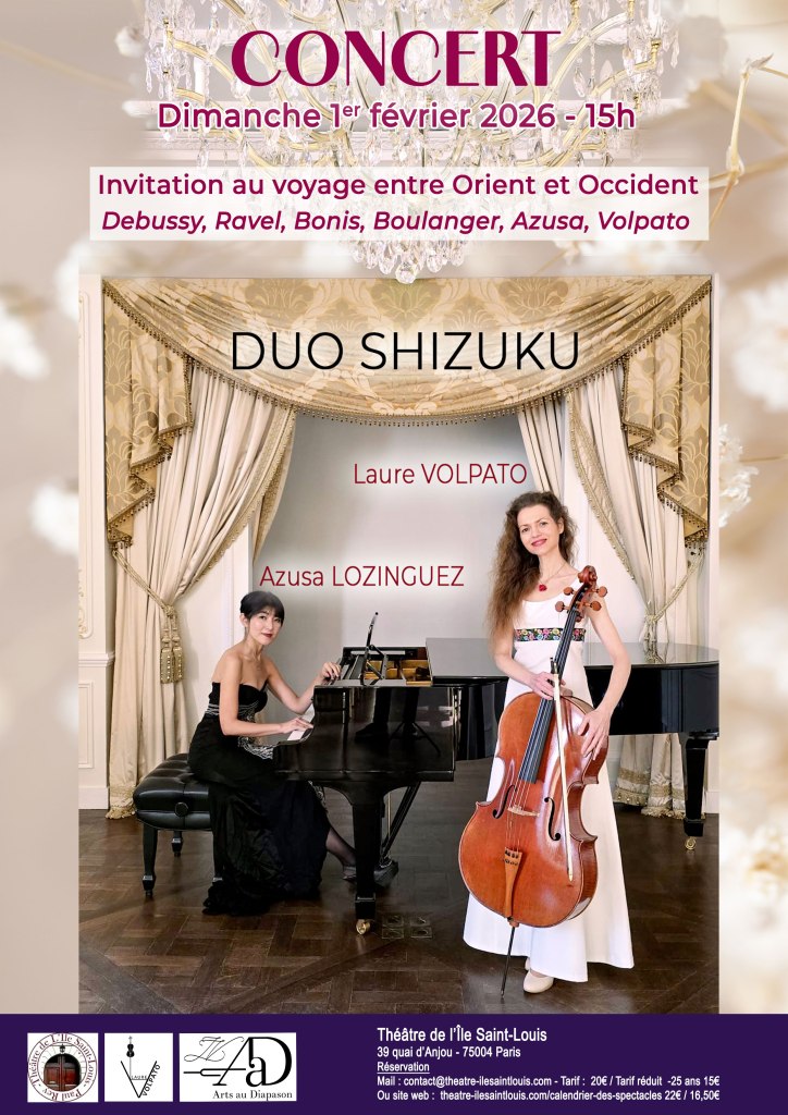 Le 01-02-26 à 15H – Duo Shizuku – Théâtre de l’Île Saint-Louis Paris, Laure Volpato, violoncelle, Azusa Lozinguez, piano