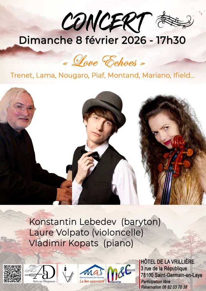 Le 08-02-26 à 17H30 – Hôtel de la Vrillière, Saint-Germain-en-Laye – Love Echoes – Concert de musique Chansons – Konstantin Lebedev (baryton), Laure Volpato (violoncelle), Vladimir Kopats (piano)