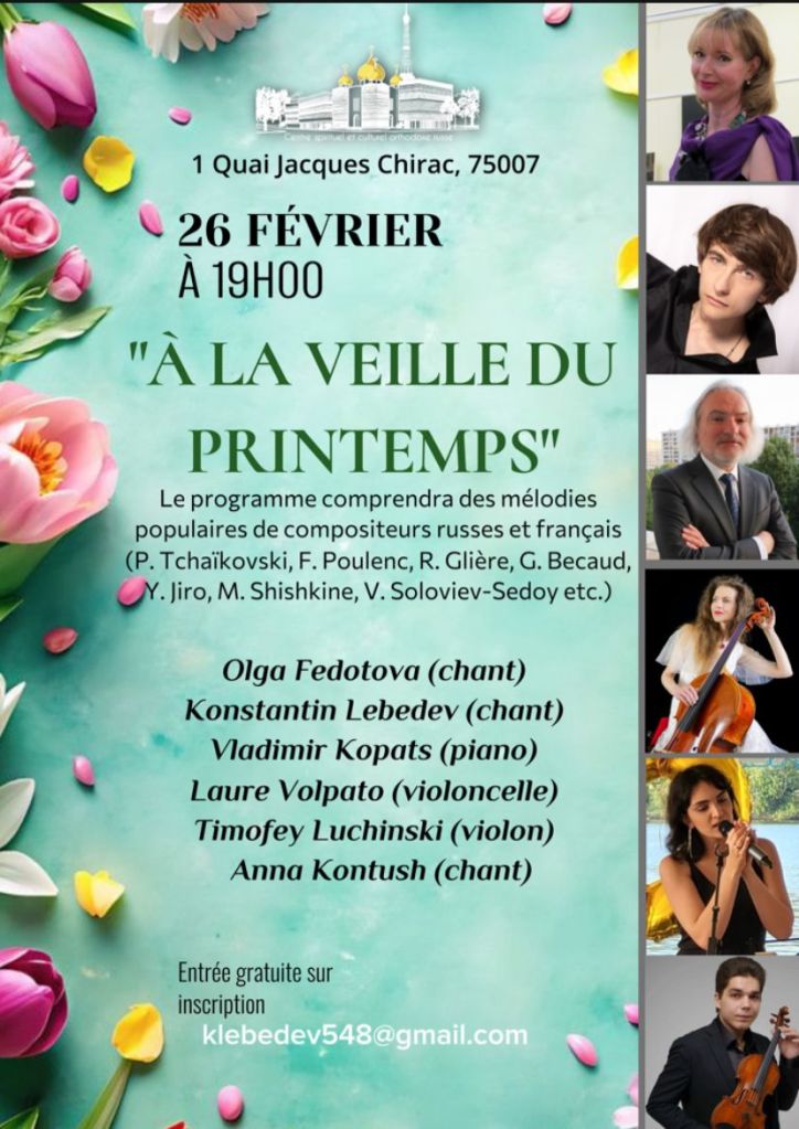 Le 26-02-26 – 19H – Centre Sprituel et Culturel Orthodoxe Russe – Concert, Olga Fedotova, chant, Konstantin Lebedev, chant, Laure Volpato, violoncelle, Vladimir Kopats, piano