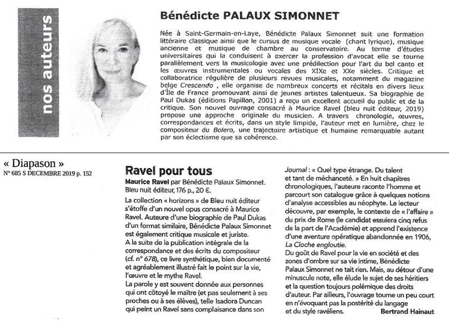 Descendante d’Adolphe Nourrit, née à Saint Germain en Laye, Bénédicte Palaux Simonnet se tourne vers la musique et la musicologie avec une prédilection pour l’art du bel canto et les œuvres vocales et instrumentales des XIXème et XXème siècle. Critique, conférencière et collaboratrice de plusieurs revues musicale, elle organise également de nombreux concerts en Ile de France. Sa biographie de Paul Dukas ( éditions Papillon), comme celles de Maurice Ravel (bleu nuit éditeur) ont reçu un accueil remarquable du public comme de la critique spécialisée. Elle vient de signer la biographie de Jean-Baptiste Lully, compositeur de Louis XIV et de Molière à l’occasion du 400ème anniversaire de la naissance du grand drammaturge.