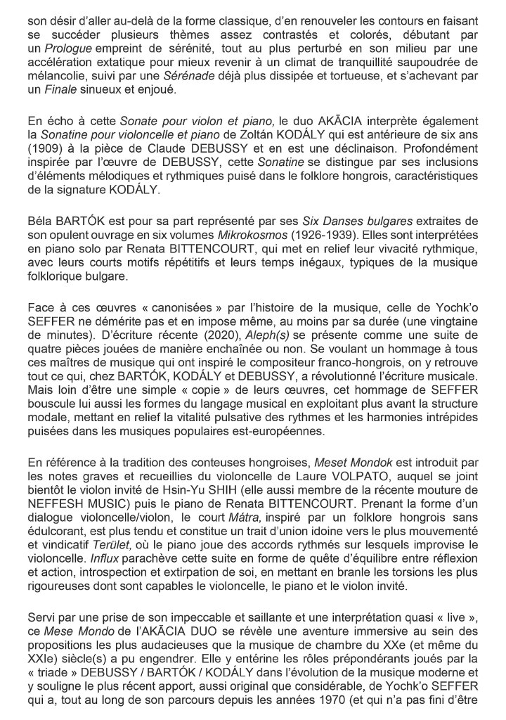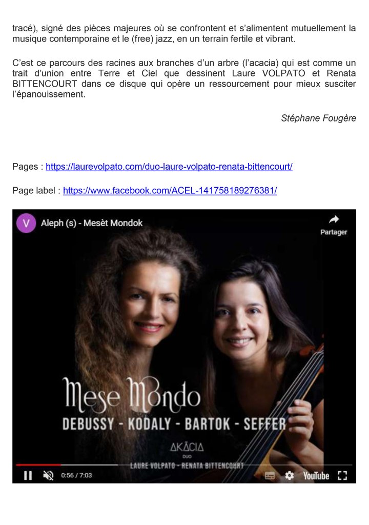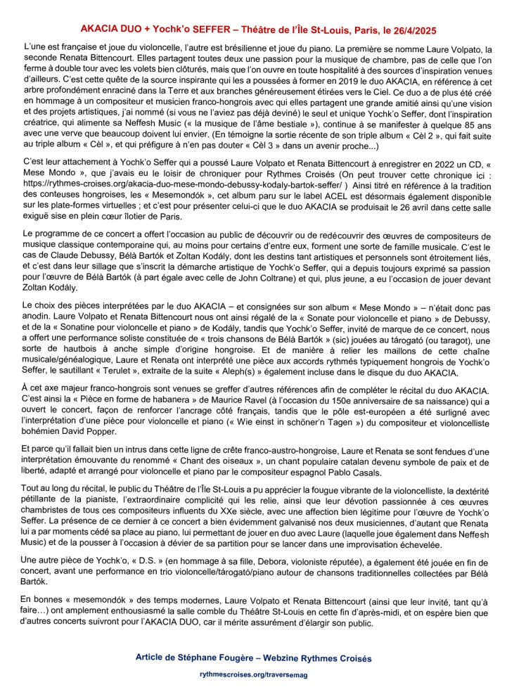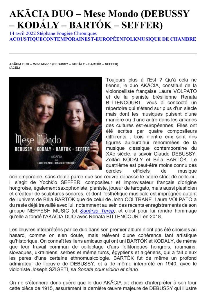 Laure VOLPATO, violoncelliste française et Renata BITTENCOURT, pianiste brésilienne, talentueuses artistes passionnées par la musique de chambre, invitées à se produire en France et à l’étranger, fondent en 2019 le duo AKĀCIA [okatsio] en hommage à Yochk’o SEFFER, artiste franco-hongrois avec lequel elles partagent Amitié, démarche et projets artistiques.
