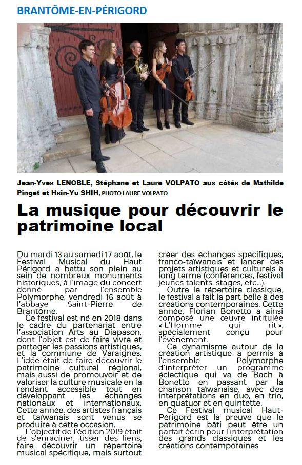 Ce partenariat prend la forme du Festival International du Haut Périgord créé initialement en août 2018 à Varaignes et appelé à rayonner dans la région.