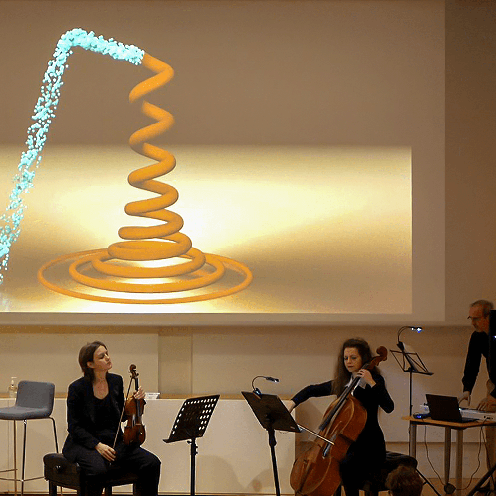 Human XXI trouve son point de départ dans la rencontre du monde classique musical, notamment les instruments à cordes et la création graphique vidéo 2D/3D entremêlée de sonorités électroniques.